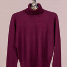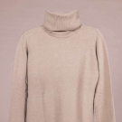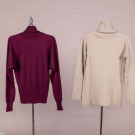 Burgundy cashmere turtleneck pullover sweater, label “Real Cashmere, Made in Italy”, attributed to Halston, 1972, B 32”-36”, L 21”. 1 beige knit turtleneck sweater, label “Halston International”. Both very good. Provenance: Museum at FIT.