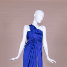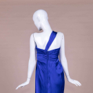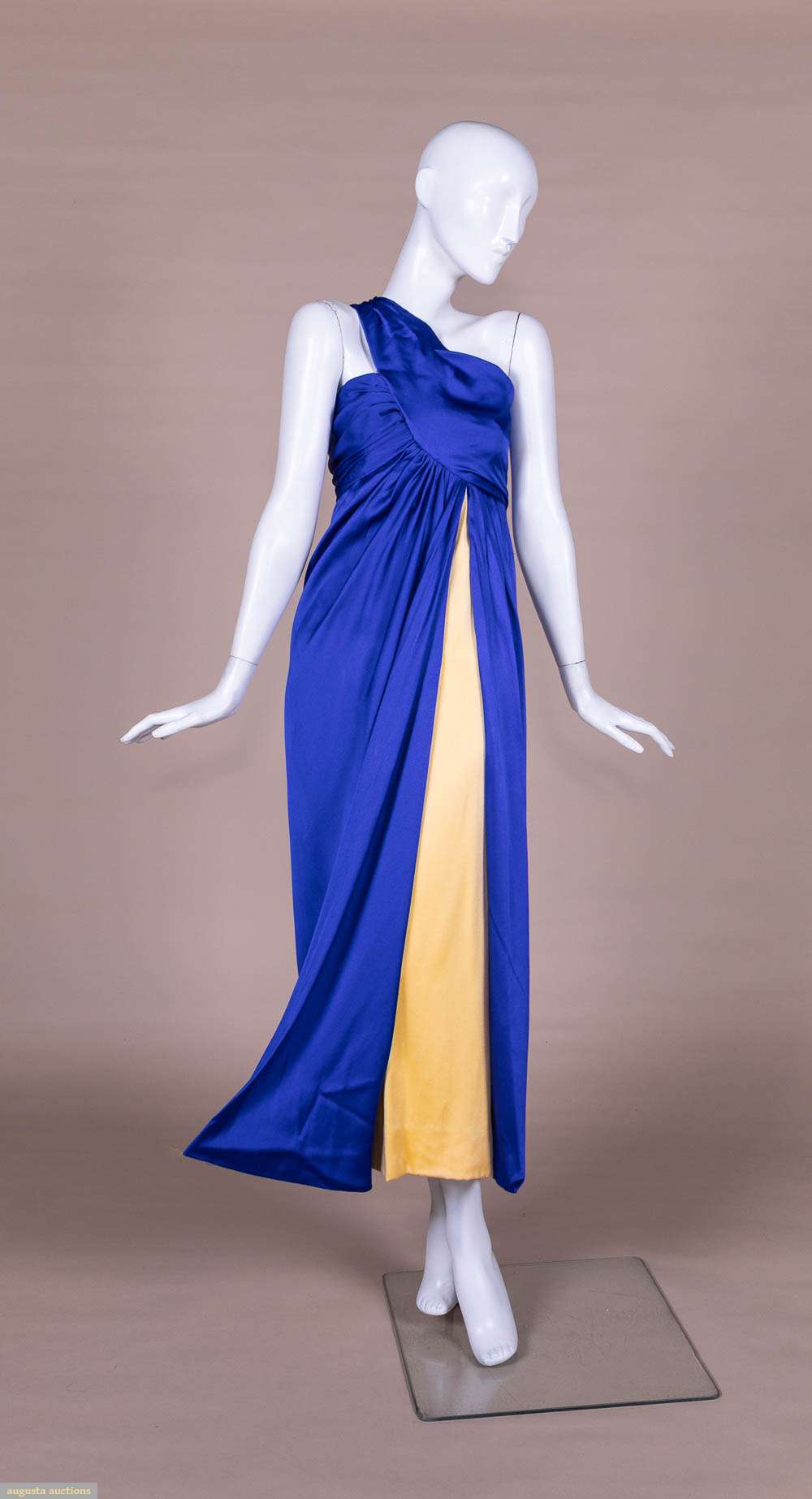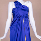 Sapphire blue single-shoulder silk satin evening dress, yellow crepe skirt lining revealed at center front slit, couture interior bodice, attributed to Karl Lagerfeld at Chloe, B 31”, W 26”, L 48”. Excellent.