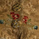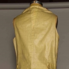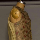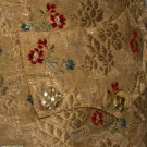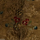 Metallic gold w/ gold floral matalesse pattern brocaded w/ blue & red flowers, collarless, 10 CF buttons w/ paste stones & 3 on each pocket, yellow linen twill backing, CH 38", FL 31", BL 23", (some buttons missing embroidery & paste stones, neckline topturned under 1", linen back enlarged) very good. BROOKLYN MUSEUM
