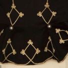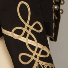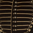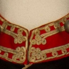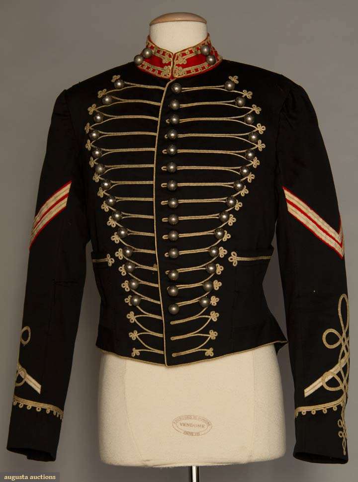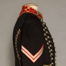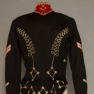 Black wool broadcloth, waist length, small peplum back, silver ball buttons on red band collar & on CB & triple button front row, trimmed throughout w/ white looped soutache braid, white on red chevron sleeve patches, 2 outside welted pockets, 2 innerpockets: 1 w/ label "Hughes & Muller Philadelphia", inked "C.F. Henry", quilted & padded black wool & cotton linings, CH 38", L 21", (3 holes in wool top layer: 2 by each shoulder & 1 by braid at low center button) very good. BROOKLYN MUSEUM