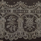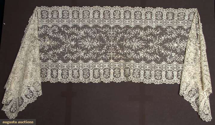 Handmade bobbbin lace on machine net, delicate center floral & vine field, flowers set amongst geometric repeating edge motifs, 28" x 114", excellent. BROOKLYN MUSEUM
