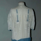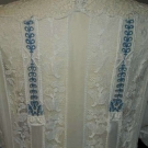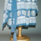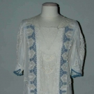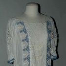 White cotton voile w/ bobbin & fillet lace inserts, blue eyelet embroidery & blue hip sash, B 38", H 40", L 49", excellent.