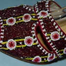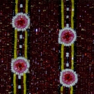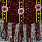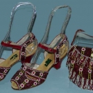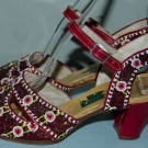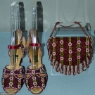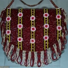 Made in the Phillipines, 2.75" red leather heel, ankle strap sandals covered in red beads w/ small white & pink circles on black & yellow stripes, insole w/ "Manila" tag, "5" stamped on bottom of sole & matching small fringed purse, excellent.