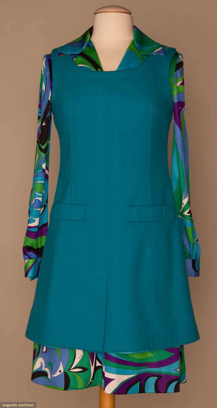 2 pieces: 1 turquoise, white, green & black synthetic knit dress & matching tie belt, B 36", H 36", L 38" & 1 bonded wool turquoise jumper, buttons at top shoulder straps, B 36", H 36", L 33"; stewardesses wore dress alone or dress w/ jumper, excellent;t/w ephemera showing this Braniff uniform.