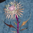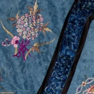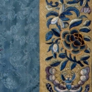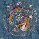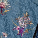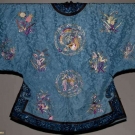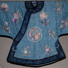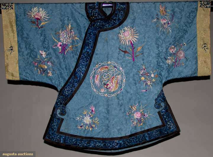 Sky blue silk damask w/ embroidered flower bunches in shades of pink & gold, large single crysanthemums, rondels w/ coiled dragons, perimeter bands blue embroidery on black, cuffs blue flowers on cream, Slv-Slv 54", L 36.5", (collar worn, 2 missing buttons) very good.
