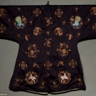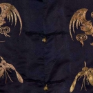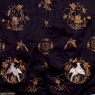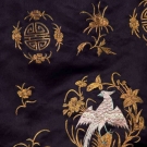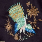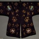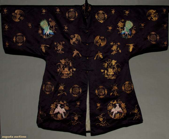 Black silk satin, 5 brass buttons on center opening, couched metallic gold embroidery, natural plant groupings, bats, butterflies, Chinese iconography, back & front of each sleeve has 1 colorful satin stitch peacock & each lower front side of coat has 1pink & blue embroidered game bird, pale grey silk lining, Slv-Slv 58", L 42, excellent.