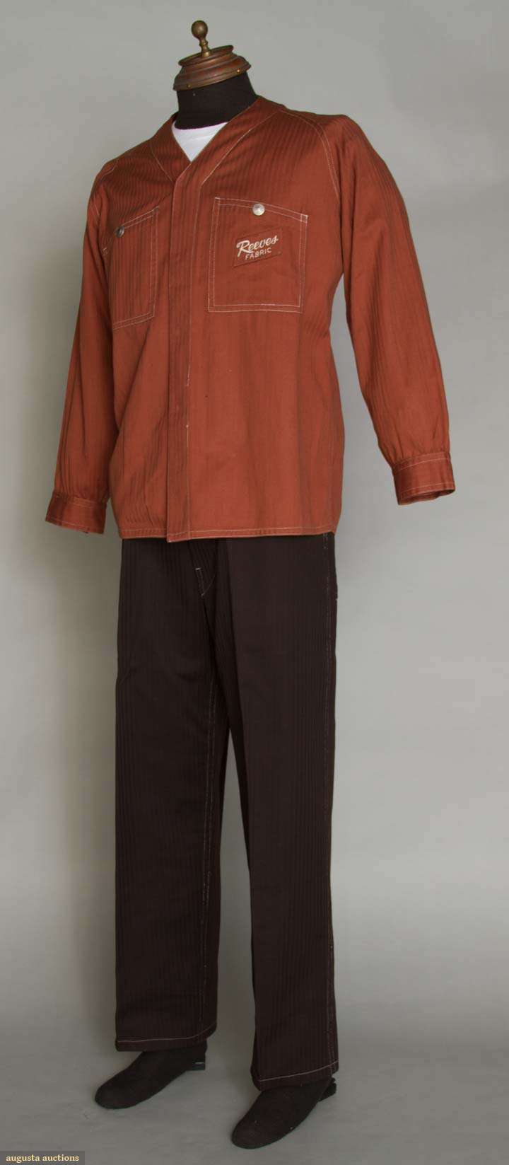 Deadstock, 2-piece cotton herringbone, both labeled "Helen Cookman" & each w/ pocket embroidered "Reeves Fabric": 1 rust collarless jacket, snap closures & 2 chest pockets; 1 pair deep chocolate brown overalls, 3 segmented bib pocket, steel hardware,adjustable snap waist, button fly, inseam 28", excellent. BROOKLYN MUSEUM