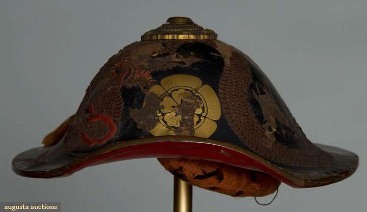 Black lacquered metal, brass top ornament, painted metal dragon circles crown, padded red cotton lining, poor. CHRYSLER MUSEUM
