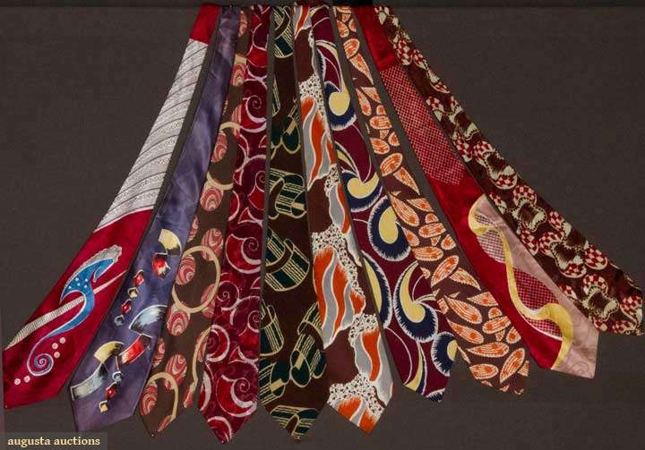Widths vary from 3.75"-4.5", all w/ at least 3 colors & w/ whimsical curvilinear patterns, fair-excellent.