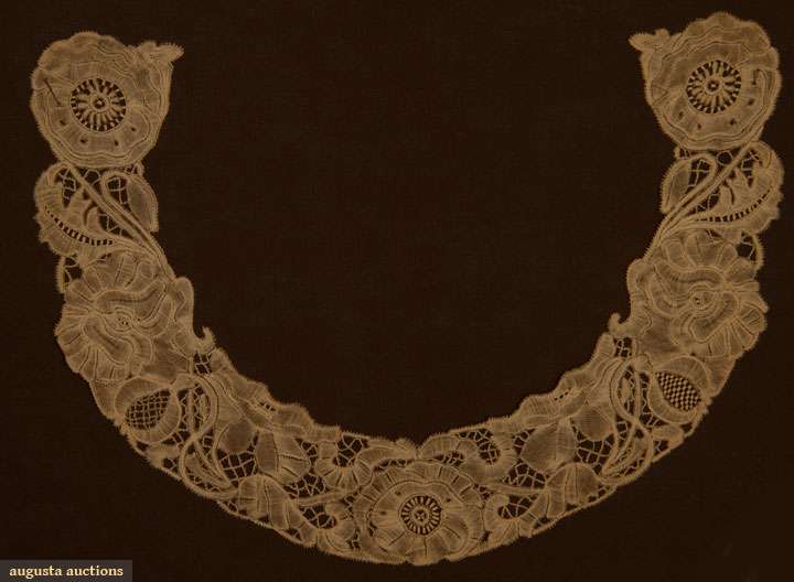 Property of, designed & made by legendary NYC lace author & early 20th C lace merchant, Marian Powys: bobbin lace collar "Poppies" in Art Nouveau pattern, 2.5" x 21", excellent; t/w 1 eyelet fragment made by Powys while at school & 1 c. 1860 3 piece Point de Gaz needle lace set consisting of collar & 2 cut pieces straight lace, very good-excellent.