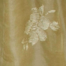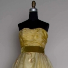 Strapeless gold organdy bodice, olive velvet attached belt, ivory organdy full skirt brocaded w/ gold & cream silk blossoms, multi-layer petticoats, boned bodice, labeled, B 36", W 26" CFL 39", excellent. Brooklyn Museum