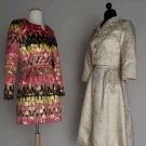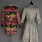 Both labeled gold lame brocade dress & jacket sets: 1 1964 white silk w/ small gold rings in paisley pattern, sleeveless dress & fitted cropped jacket, bone china silk linings, B 34", W 26", L 41", Jacket L 16"; 1 1968 set, painted, colorful zig-zag print over-laid w/ pink & gold lame, belted mini-dress w/ high cut side slits & cropped collarless matching jacket, black silk satin linings, B 34", W 27", L 32", Jacket L 16", excellent. Brooklyn Museum