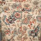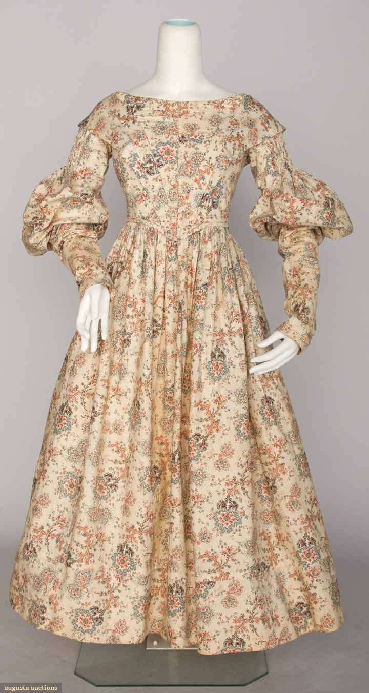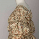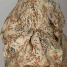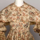 Cream cotton w/ stylized floral print in turquoise, brick red & yellow w/ black outlines, sleeve tops ruched, piped bodice, double layer pelerine, B 31", Hi W 25", L 45", (pea size hole, stains, period mends) fair. BM