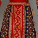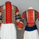 All w/ bands of red & blue cotton covered w/ embroidery & multicolor lace trim: 1 young girl's blouse & apron & 1 woman's blouse, very good-excellent. BM