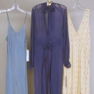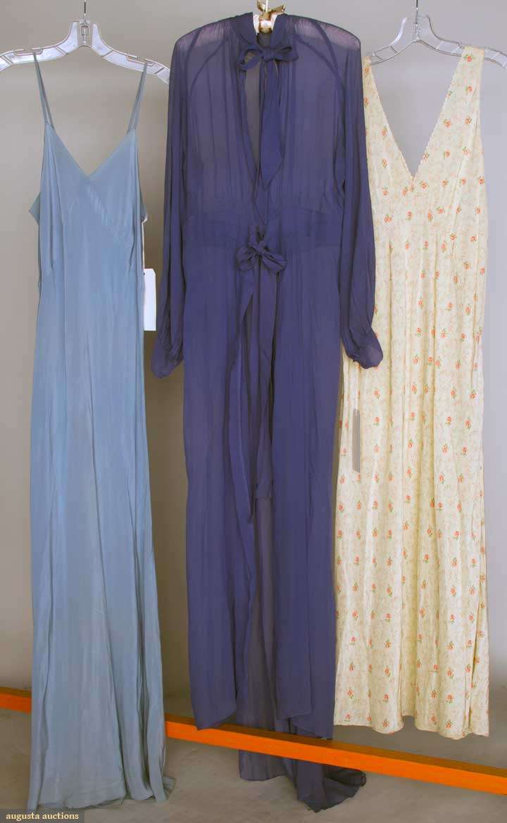 1 floral printed white negligee, 1 blue negligee, 1 dark blue chiffon peignoir, very good-excellent. FIDM