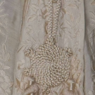 Cream silk w/ cream embroidery, fitted back w/ large knotted & tasseled medallion, edged w/ knotted silk fringe, L 22", Fringe 8", excellent. Diane Gross Collection