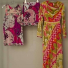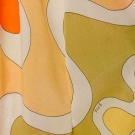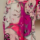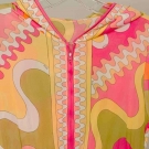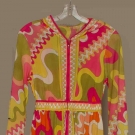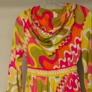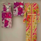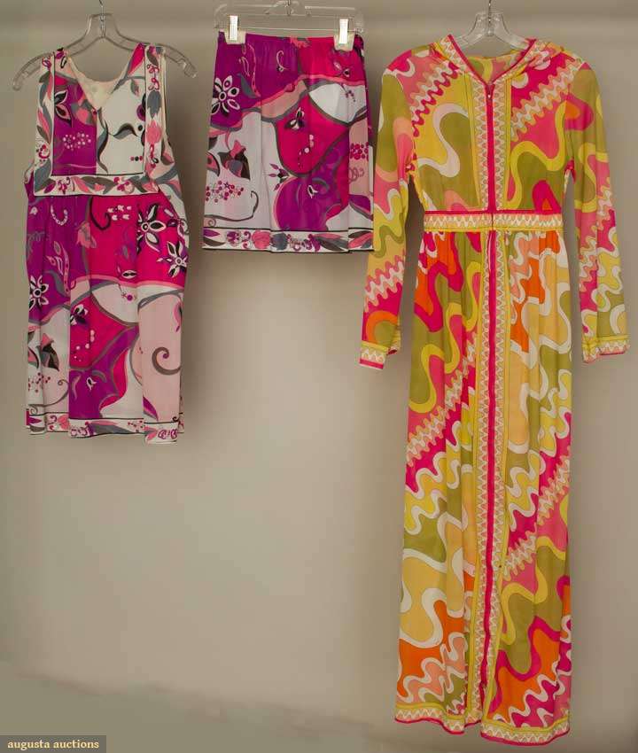All labeled "Emilio Pucci for Formfit Rogers" & fabric signed "EPFR": 1 hooded negligee, orange, tan & pink print on white (2" mend, zipper wavy), fair; 2 pieces w/ identical print in shades of pink w/ gray, black & white: 1 baby doll negligee (button missing) very good & 1 mini half slip, excellent.