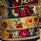 All dark indigo: 1 cream embroidery, (holes) fair & 2 multi-colored, excellent.