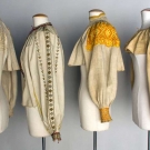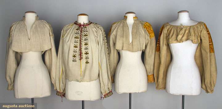 1 Ukraiaian, gold & silver metallic, red & black embroidery, excellent; 3 Slovakian, all cropped w/ crimped linen bodies & embroidered large balloon sleeves: 1 orange embroidery, 1 orange & yellow & 1 beige & tan, (some stains) very good. BM