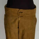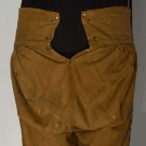 Brown linen suit dyed w/ butternuts: 1 unlined jacket w/ self fabric buttons, 10 front & 2 back, 2 pockets w/ flaps, Ch 36", L 43"; 1 pair matching breeches lined w/ natural linen, waist band laces CB, 6 brass knee buttons, W 30"-32", Inseam 17", (knee bands' original buckles missing & replaced w/ buttons, scattered fade spots on coat & breeches) excellent. Provenance: Mason family, Bristol, CT.