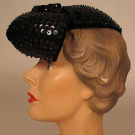 3 black: 1 open crown satin w/ long single feather & pearl brooch, "Peg Fischer" label; 1 1940s black velvet covered w/ beaded sequins, "Lord & Taylor" label; 1 black velvet pill box w/ black feather front fan, "Eisa" label; 3 pink: 1 1942 rose felt toque w/ black feather covered crown "Robert Dudley New York" label; 1 1955 dark pink silk satin toque w/ swirl top crown "Schiaparelli Paris" label; 1 1955 rose pink velvet w/ "Jean Barthet Paris" label; good-excellent. BM