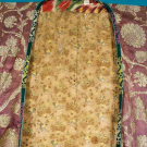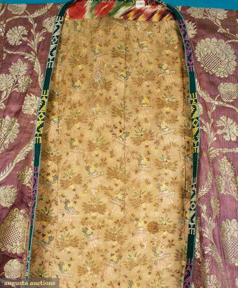 Leghorn straw, wide brim, angled deep crown, folded back bavolet, cloth flowers outside of brim, inside of brim & under bavolet, original pale pink brim lining, (3.5" crack in upper straw brim w/ adjacent 1.5" crack, flowers possibly not original) fair.