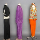 1 2-piece orange silk w/ floral print sleeveless top, (stains) very good; 1 3-piece black silk knit w/ dot & circle appliques in white & black, (holes) fair; 1 3-piece purple & white polka dot c/o short sleeved top, wide-leg pants & long sleeve jacket (fading on jacket) very good.