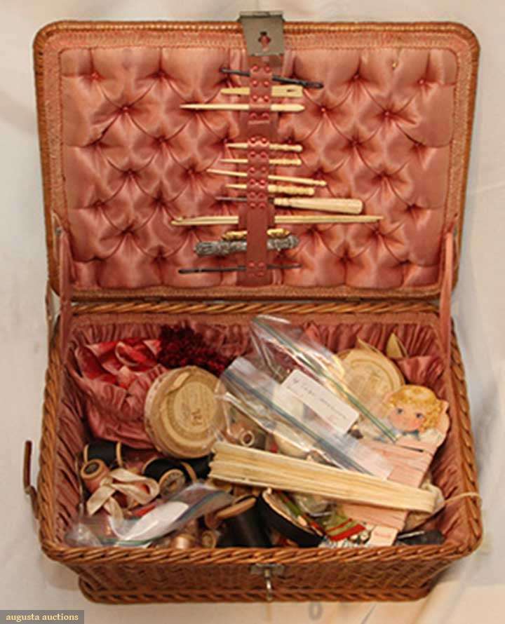 Wicker w/ silver hardware including bone/white implements, sterling needle case, painted thimble case, carved tape measure, strawberry cushions, ribbons & thread; t/w 1 carved bone fan.
