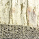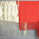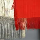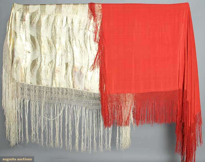 1 red fringed piano shawl; 1 ivory & gold lame fringed shawl.