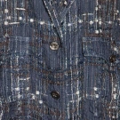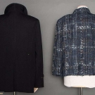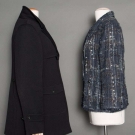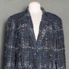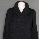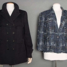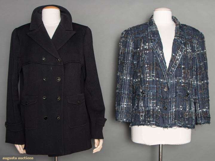 Both labeled & marked FR size 50 (US 16): 1 double breasted black ribbed wool, hip length, excellent; 1 navy, black & white woven silk, rayon & cotton blazer, silver CC logo buttons, silk lining, (many pulled threads) very good. Estate of Karen Kendle Marshe, director of footwear for CHANEL USA.