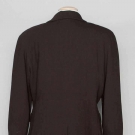 Black wool crepe, single breasted blazer w/ wide lapel & 4 front pockets w/ button flaps, short wrap skirt w/ pockets, self fabric buttons w/ silver metal chain & logo, labeled, marked French size 50 (US 16), Jacket L 30", Skirt L 21", excellent. Estate of Karen Kendle Marshe, director of footwear for CHANEL USA.