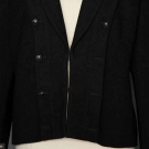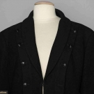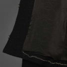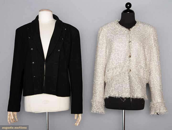 Both labeled & marked FR Size 48 (US 14): 1 black wool w/ shawl collar, front hook & eye closure, row of buttons on either side of CF opening, gunmetal chain weight, L 23.5", (2 missing front buttons) very good; 1 synthetic, cotton & wool blend in pink, green, ivory, silver & gold, fringed edges, jeweled neckline, 2 front inset pockets, deep flounces on hem & cuffs, gold logo buttons, original price tag "$3,190", excellent. Estate of Karen Kendle Marshe, director of footwear for CHANEL USA.