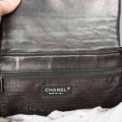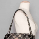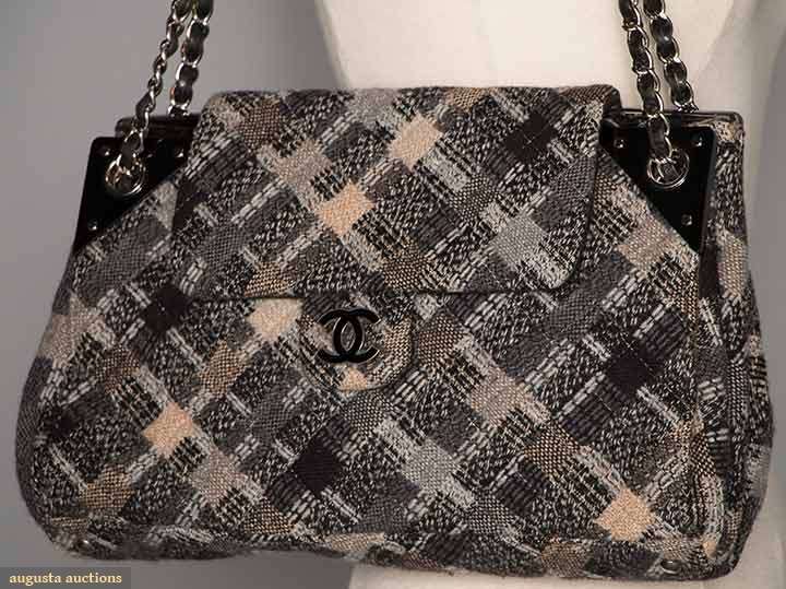 Black & grey tweed w/ touch of tan, woven in block patterns, quilted, black leather trims, black plastic corners, silver & leather chain, 1 interior zip pocket, enamel CC logo on front, 9" Drop, 12.5" x 9" x 5", excellent. Estate of Karen Kendle Marshe, director of footwear for CHANEL USA.