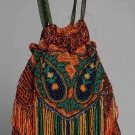 Orange, green, blue, yellow & pewter beading in paisley pattern, multi-color fringed panels & trim, green shot silk draw string & lining w/ mirror pocket, label "Made In Belgium", 7" x 8", Fringe 2.5", excellent; t/w 1 similar colored beaded bag, fair. Property of The Strong, sold to benefit museum collection fund.