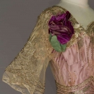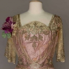 Both w/ trained skirts, lace trim & short sleeves: 1 lilac satin brocade, tulle over-dress w/ silver bugle beads & tiny silver sequins in floral & lattice motifs, B 34"-36", W 28", L 63"-80", (tulle torn at neckline & under sleeves) fair; 1 ivory silk charmeuse, white chiffon w/ gold lame brocade & Brussels lace over-skirt, white bugle beads & rhinestone band trim, hot pink chiffon CF insertion, B to 42", W 35", L 61"-74", (tulle neckline trim damaged) very good.