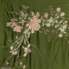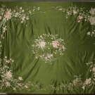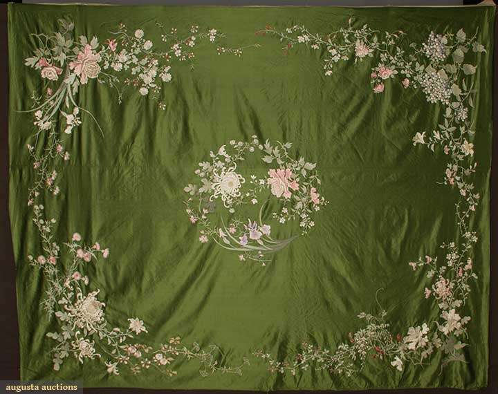 Green silk satin ground, silk floral embroidery in florals, including wisteria, iris, roses & crysanthemums, 70" X 86", (edges not bound) excellent.