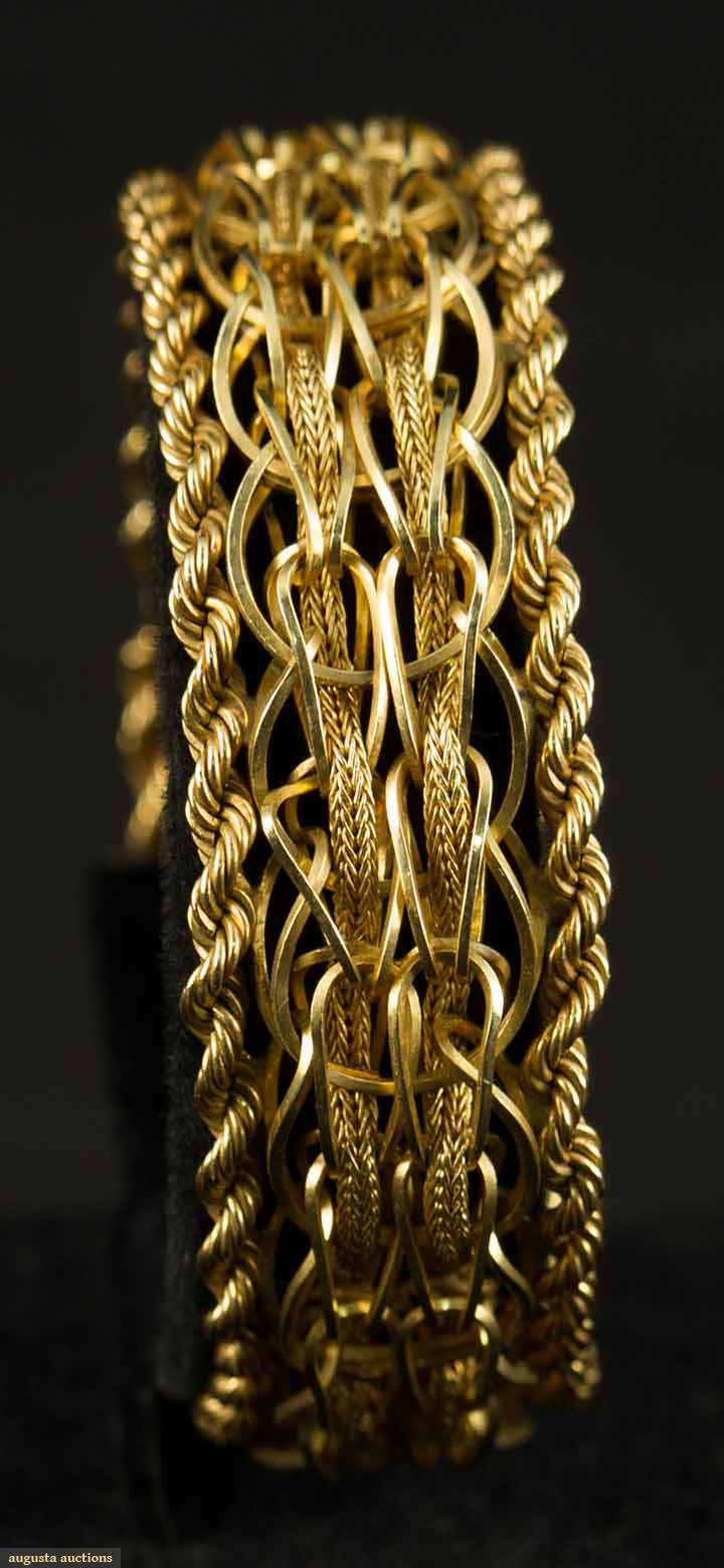 Entwined wire, chain & rope links, stamped "18k" & "Italy", 2 safety catches on clasp, L 7.75" x Wd 7/8", 38 g, excellent.