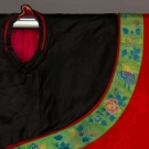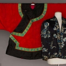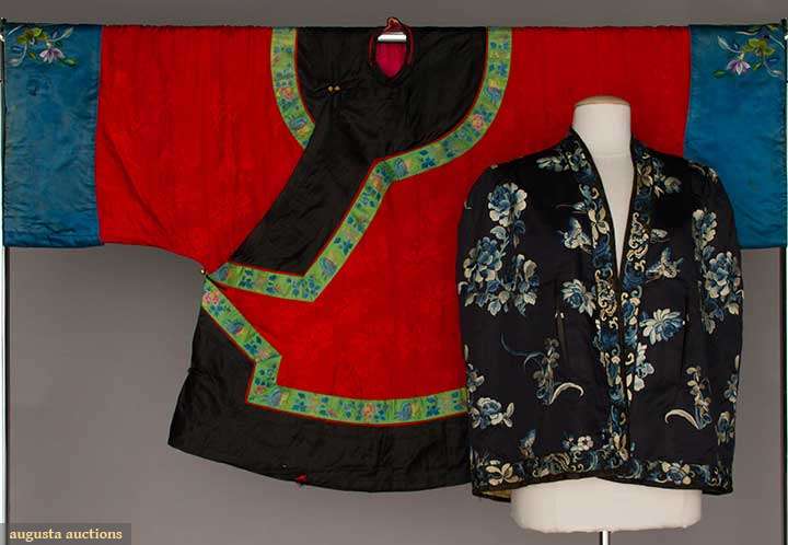 1 red silk damask jacket, black satin borders & embroidered blue cuffs, Wd 62" x L 36", (stains, wear & fabric breaks on black border edges) fair; 1 midnight blue silk satin short cape, blue & cream floral embroidery, L 25", excellent; t/w 1 white silk damask robe, horse-hoof cuffs w/ blue lining, (large blue stains near hem) fair.