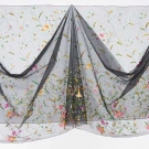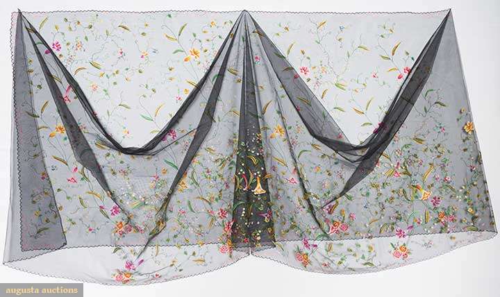 Hand embroidery in colorful floral patterns on stiffened black net, 44" x 220" (18.3'), excellent.