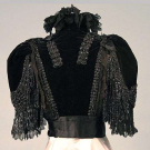Black velvet, puffed short sleeve, high collar, Chantilly lace trims on high neck, sleeves & mantle, black silk satin ribbon bows at chest & shoulders, wide black ribbon attached to CB to tie in front, black jet bead trim on neck, chest & mantle back, jet bead festoon-shaped sleeve appliques w/ double row faceted jet fringe, black silk taffeta lining, black on black woven label, "WORTH Paris", Sh-Sh 10", CBL 15", (minor bead loss, brown spots on velvet on back & under fringe, lace browning) good.