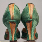 Both stamped in gold, "Saks Fifth Avenue", w/ ankle straps & metallic silver & gold trim: 1 pair green velvet, gilt gold leather & snakeskin stamped silver leather in Deco pattern, Heel 3", Wd 2.75", L 9.5", marked 6A, (tan stain to velvet on 1 shoe) good; 1 pair turquoise silk satin, on vamp criss-cross wide band of gold & silver narrow leather strips, yellow rhinestone buckle, Heel 3.25", Wd 3", L 10.5", marked 7.5AA, (few missing stones on I buckle) excellent.