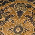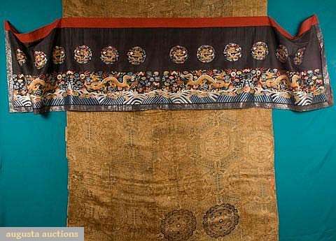 1 c. 1885 embroidered horizontal panel from man's court robe, black silk & multicolor silk embroidery, 2 pair gold dragons facing each, row of small rondels above, 25"X100", (red lining damage, blue & silver border unstitched) excellent; 1 large gold & blue pieced silk & metallic brocade panel, pattern of rondels w/in hexagon grid, 4 seams, cotton gauze backing, date unknown, (extensive wear all over) fair. MFA, Boston