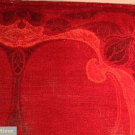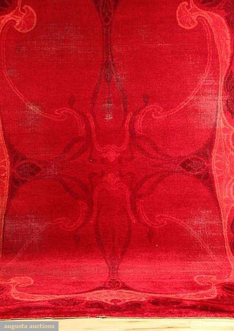 Light & deep red on deep red wool ground, Art Nouveau imagery similar to florals on a MacMurdo cut velvet published in Naylor's THE ARTS & CRAFTS MOVEMENT, plate 34, English or French, 8'x11.6', (pile worn in places showing bare warps) fair. CMA, VA