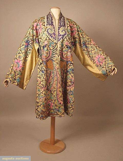 Cream silk satin w/ allover embroidery in shades of blue, pink, black & metallic gold, dominant motif of peacock & flowers against black diamond grid, embroidery couched in gold, straight kimono sleeves, deep side sllits, blue cotton lining, shaped blue satin appliqued collar, L 40", (silk cord loop & button torn, upper neckline worn) excellent.