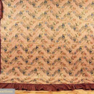 Peach faille ground, meandering metallic gold & silver ribbons, floral bouquets in peach, rose & blues, pieced in 4 places, selvedge-selvedge 20.5", coverlet 82"X100", dusty plum silk skirt, L 11", (few spot stains in brocade & couple small holes in skit), good.