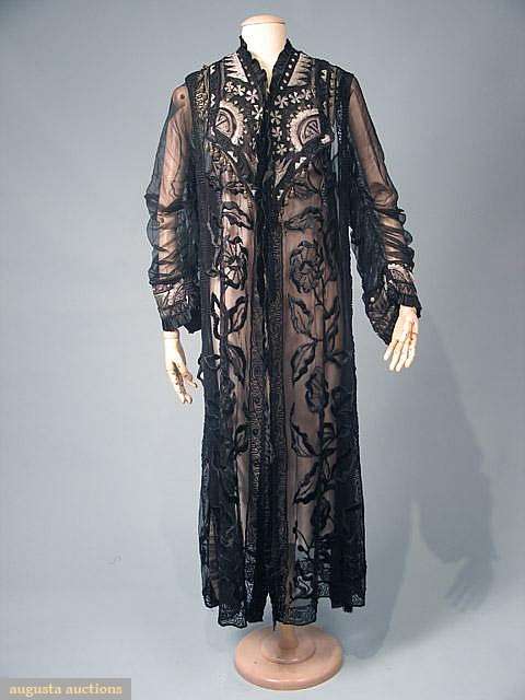 Full length black leno weave coat, long ruched sleeves, turn-back collar embroidered w/ silver & pale blue metallic designs edged w/ gold knotted tassels, body of coat embroidered w/ large black silk flowers & black soutache bands, B 34", L 54", (minor thread pulls, lining missing, few missing gold tassels) good. BMCC