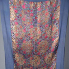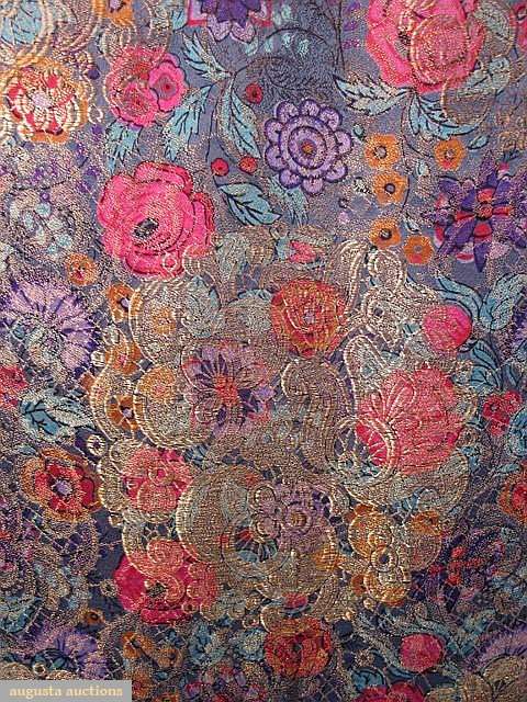 Center field w/ flowers in red, blue, turquoise, pink, lilac & golden yellow, inset w/ rondels of similar flowers densly brocaded in exotic patterns of gold lame, delicate lame patterns on surrounding ground, reverse effect on back side, 6" blue chiffon border w/ pale lilac satin squares in each corner, 48" x 76", (top & bottom chiffon borders water stains & discolored, slight oxidation to lame) good. BMCC