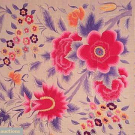 Blush pink silk, corners heavily embroidered w/ bouquets of large peonies & exotic flowers in shades of pink & red, foliage in shades of lilac to grey, smaller flowers include yellow tulips, plum blossoms, fuchias & more, macrame & knotted20" long pink silk fringe, 63"X72", (2 pea size water stains) good.