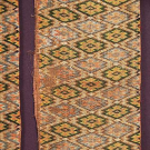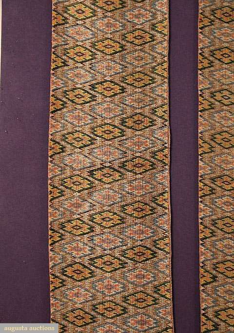 Canvaswork in silk floss, stitched in two stylized diamond designs: in green, yellow & peach & in blue, cream & peach, brown linen backing, originally 2 long panels, 1 cut to make 4, all Wds 11", Lengths: 285", 64", 84", 81", 66", (frayed edges, repairson 4 short panels) longest piece - excellent, other 4, fair-good. CMA, VA