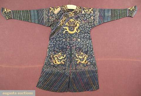 9 5-toed dragons in couched gold, bats, auspicious symbols, & waves embroidered in multicolor outline stitches, sleeve extensions of denser blue silk gauze, black silk gauze neck band & cuffs w/ couched gold dragons & other symbols, edged w/ blue & metallic silk brocade, Cuff-Cuff 84", L 51.5" (large tan stain, holes at both shoulders, 1 nickel & 1 dime size, 1 of 5 brass buttons missing, faint white spotting at bottom stripes & larger on front L sleeve) fair. CMA, VA
